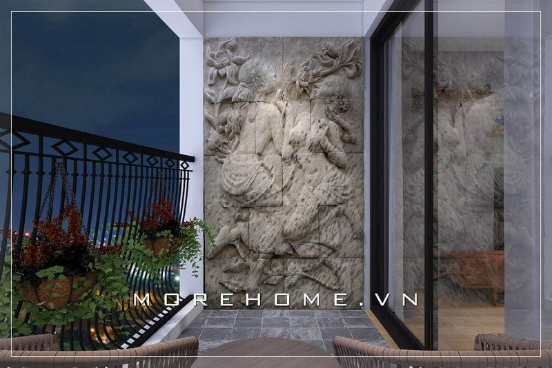 . Ban công biệt thự được thiết kế đẹp với bức tường ốp đá điêu khắc nghệ thuật, tạo nên điểm nhấn ấn tượng và góp phần tạo nên vẻ đẹp sang trọng cho ngôi nhà.