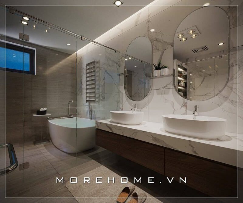 Mẫu đá ốp trắng cao cấp với những đường vân loang xám ấn tượng sẽ làm cho không gian phòng tắm trở nên sang trọng và đẳng cấp.