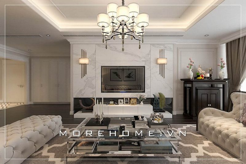 Thiết kế nội thất phòng khách theo phong cách hiện đại, để tạo nên sự ấn tượng, trang trí vách tường bằng tivi ốp đá nhân tạo màu trắng sang trọng sẽ làm nên sự lịch sự và tinh tế cho không gian nhà phố, lô phố, biệt thự.