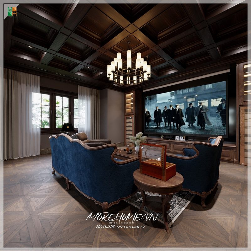 Bộ bàn ghế sofa được làm từ gỗ óc chó bọc nỉ màu xanh coban, thiết kế cổ điển với đường nét uyển chuyển mềm mại, giúp cho gia chủ có trải nghiệm sử dụng thoải mái.